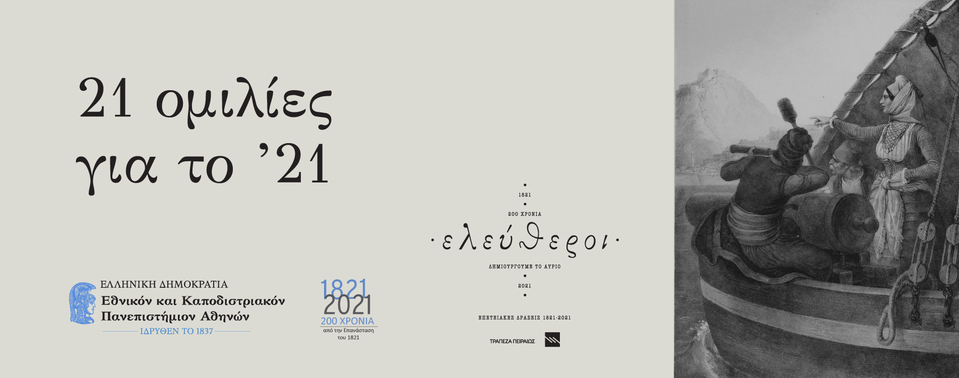 Πάνω σε αυτήν την πραγματικότητα έχει δομηθεί ο κύκλος ομιλιών με τίτλο «21 ομιλίες για το ’21». Κατά τη διάρκεια του κύκλου αυτού, είκοσι διδάσκοντες και διδάσκουσες του Εθνικού και Καποδιστριακού Πανεπιστημίου Αθηνών, με τις είκοσι μία ομιλίες τους, θα επιχειρήσουν να αναλύσουν το πλαίσιο, να ερμηνεύσουν τα γεγονότα, να διαφωτίσουν τις εξελίξεις ούτως ώστε να γίνει κατανοητό το μέγεθος και η σημασία των πολλών παραμέτρων της Ελληνικής Επανάστασης. Αυτής που, διακόσια χρόνια πριν, γέννησε το ελληνικό κράτος θέτοντας τις βάσεις τής μέχρι σήμερα πορείας του.
