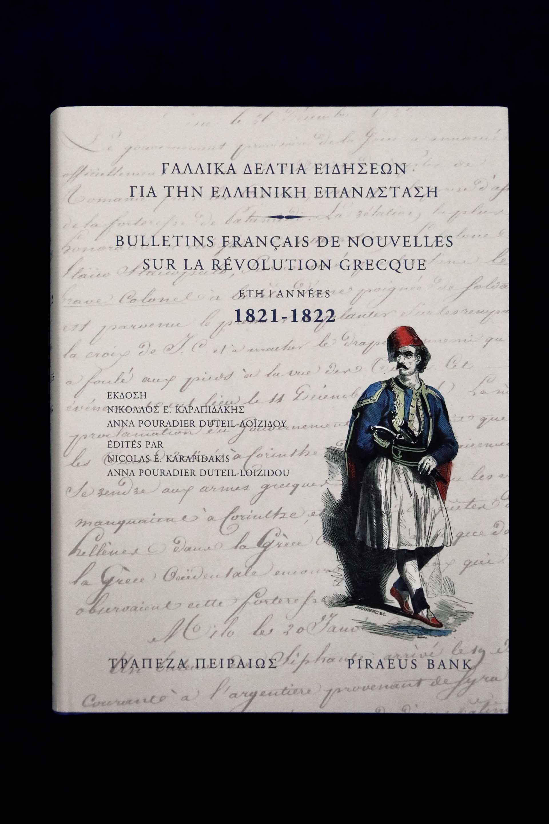 Την έκδοση «Γαλλικά Δελτία Ειδήσεων για την Ελληνική Επανάσταση. Έτη 1821–1822», που βασίστηκε σε τεκμήρια από τα Αρχεία του Γαλλικού Υπουργείου Εξωτερικών, επιμελήθηκαν η τ. Διευθύντρια του Κέντρου Επιστημονικών Ερευνών της Κυπριακής Δημοκρατίας κα Άννα Pouradier Duteil - Λοϊζίδου, η οποία και «ανακάλυψε» στα γαλλικά αρχεία το πολύτιμο αυτό υλικό, και ο Καθηγητής του Ιονίου Πανεπιστημίου και τ. Πρόεδρος της Εφορείας των Γενικών Αρχείων του Κράτους κ. Νικόλαος Καραπιδάκης. Η έκδοση εικονογραφήθηκε με χαρακτικά της εποχής ώστε ο αναγνώστης να συσχετίζει τις πληροφορίες του κειμένου με την ιστορική περίοδο και να κάνει ένα διπλό ταξίδι, εικονικό και κειμενικό.