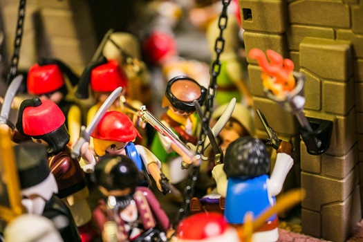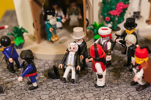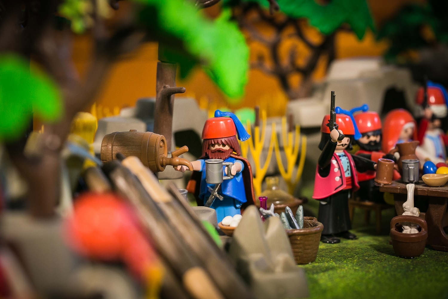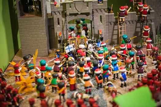 Ο Όρκος των Φιλικών, η Άλωση της Τριπολιτσάς, η Έξοδος του Μεσολογγίου, η Φυγή των Παργινών, είναι κάποια από τα διοράματα που δεσπόζουν στην έκθεση. Πρωταγωνιστές της Επανάστασης, Έλληνες, Φιλέλληνες και Οθωμανοί, άντρες και γυναίκες που έπαιξαν σημαντικό ρόλο στην εξέλιξη των γεγονότων, παρουσιάζονται σε φιγούρες PLAYMOBIL, συνοδευόμενοι από σύντομο βιογραφικό τους. Έτσι οπτικοποιούνται, με κατανοητό και ευφάνταστο τρόπο, όσα θέλει να αφηγηθεί η έκθεση και η Ιστορία γίνεται ένα απολαυστικό ταξίδι όχι μόνο για μικρούς αλλά και για μεγάλους.